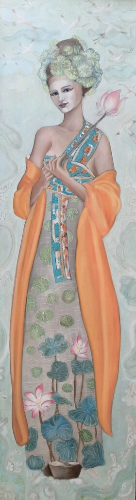 Madonna met Lotusbloem, olieverf op paneel, 40x140 cm, ingelijst, € 950