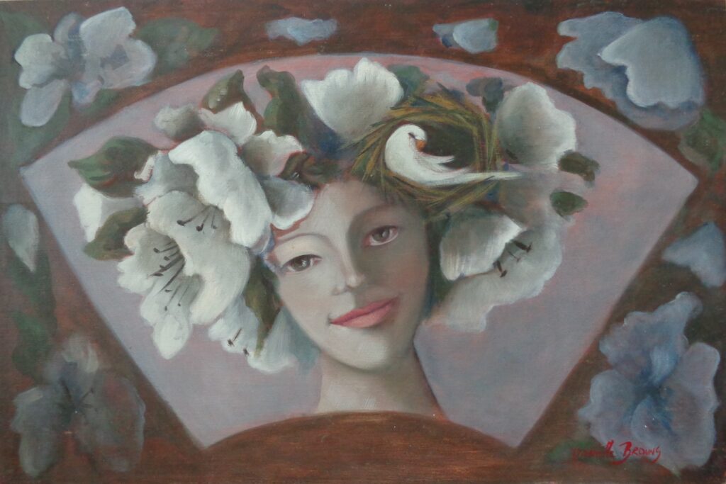 Vrouw met vlinders in hoofdtooi, olieverf op paneel, 16 x 37 cm, gesigneerd aan zijkant, € 175