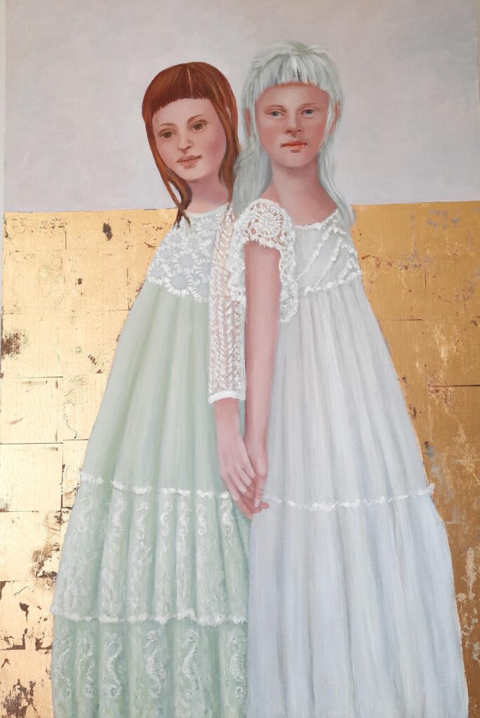 Vriendinnen, olieverf en 23 krt bladgoud op paneel, 60 x 90 cm, € 650