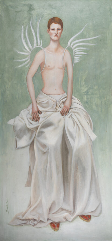 Androgyne figuur met roze bloemen en witte rok, olieverf en 23 krt bladgoud, € 100