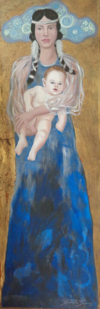 Madonna met rode kimono, olieverf en 23 krt bladgoud op doek, 25 x 60 cm, ingelijst, € 450