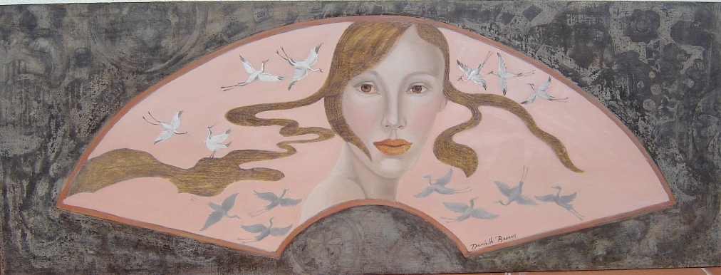 Kraanvogels, olieverf en bladzilver op paneel, 110 x 40 cm, ingelijst, € 950