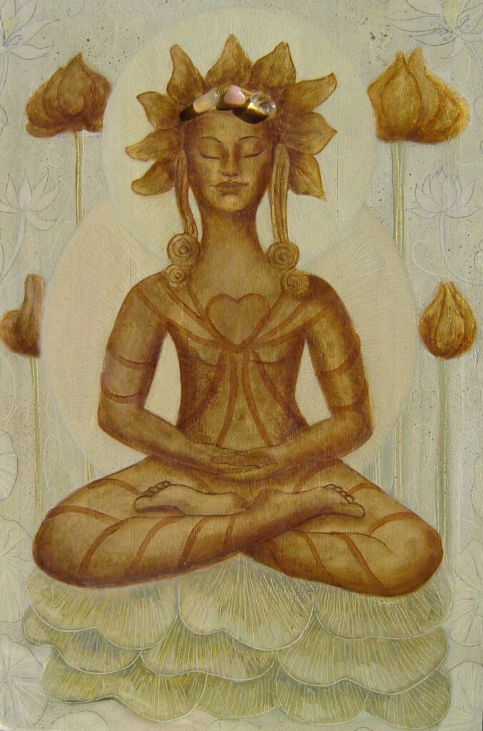 Boeddha van de meditatie, olieverf, 23 krt bladgoud, halfedelstenen fluroriet, amazoniet en rozenkwarts op ikonen paneel, 50-70 cm, € 750